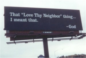 The image posted here is the only one that spoke to the fifth aspect of love that Jesus teaches. The irony of the reminder this billboard alludes to is not lost on me, as if the “loving neighbor” aspect has been lost in the shuffle of an individually-focused – its’ all about me , personal salvation Christianity to the point that a clever billboard is the only way to breakthrough! It seems to me we have a tough time comprehending that the necessary aspects of loving our God, Father and Holy Spirit requires an ‘other’.