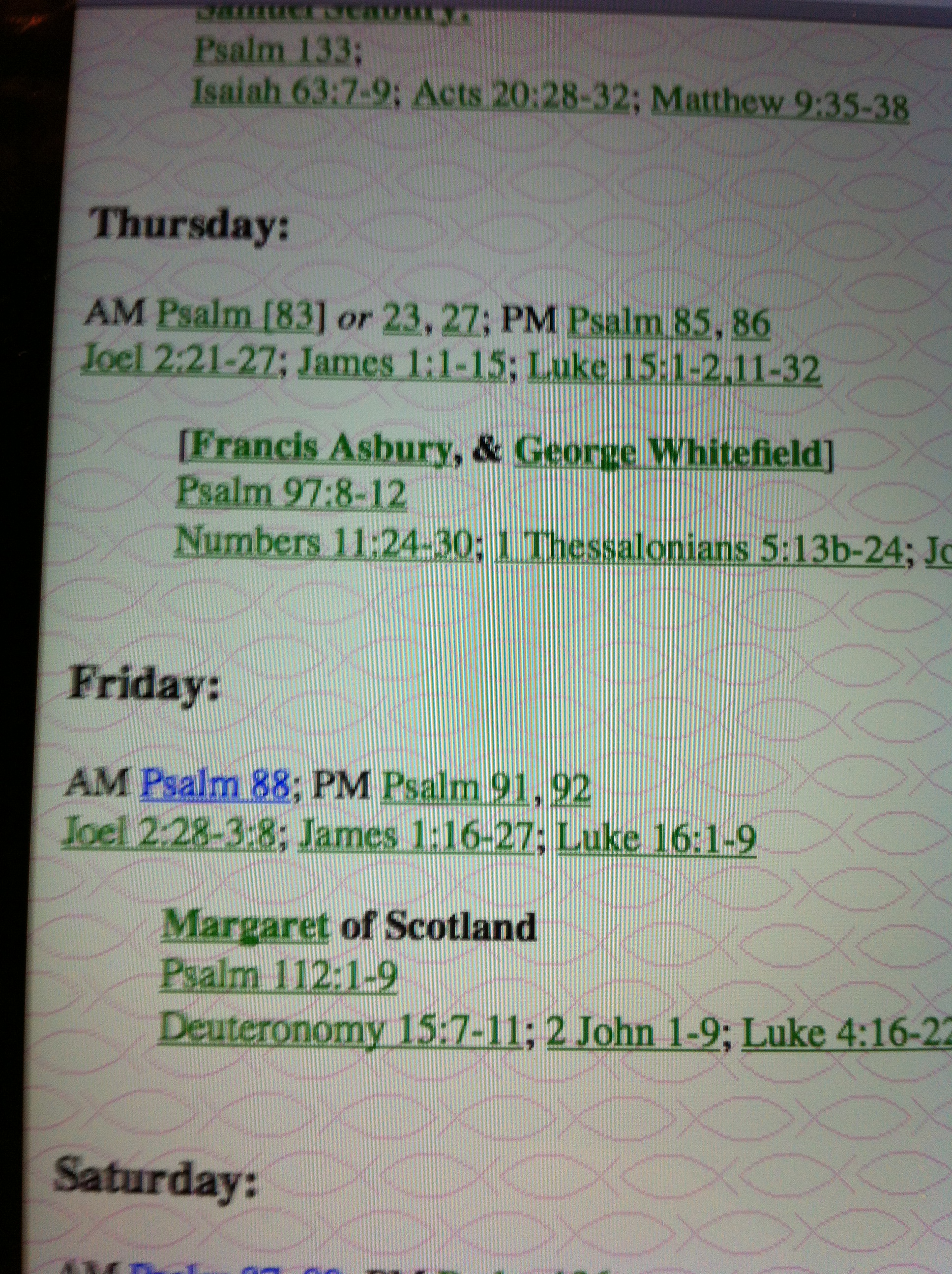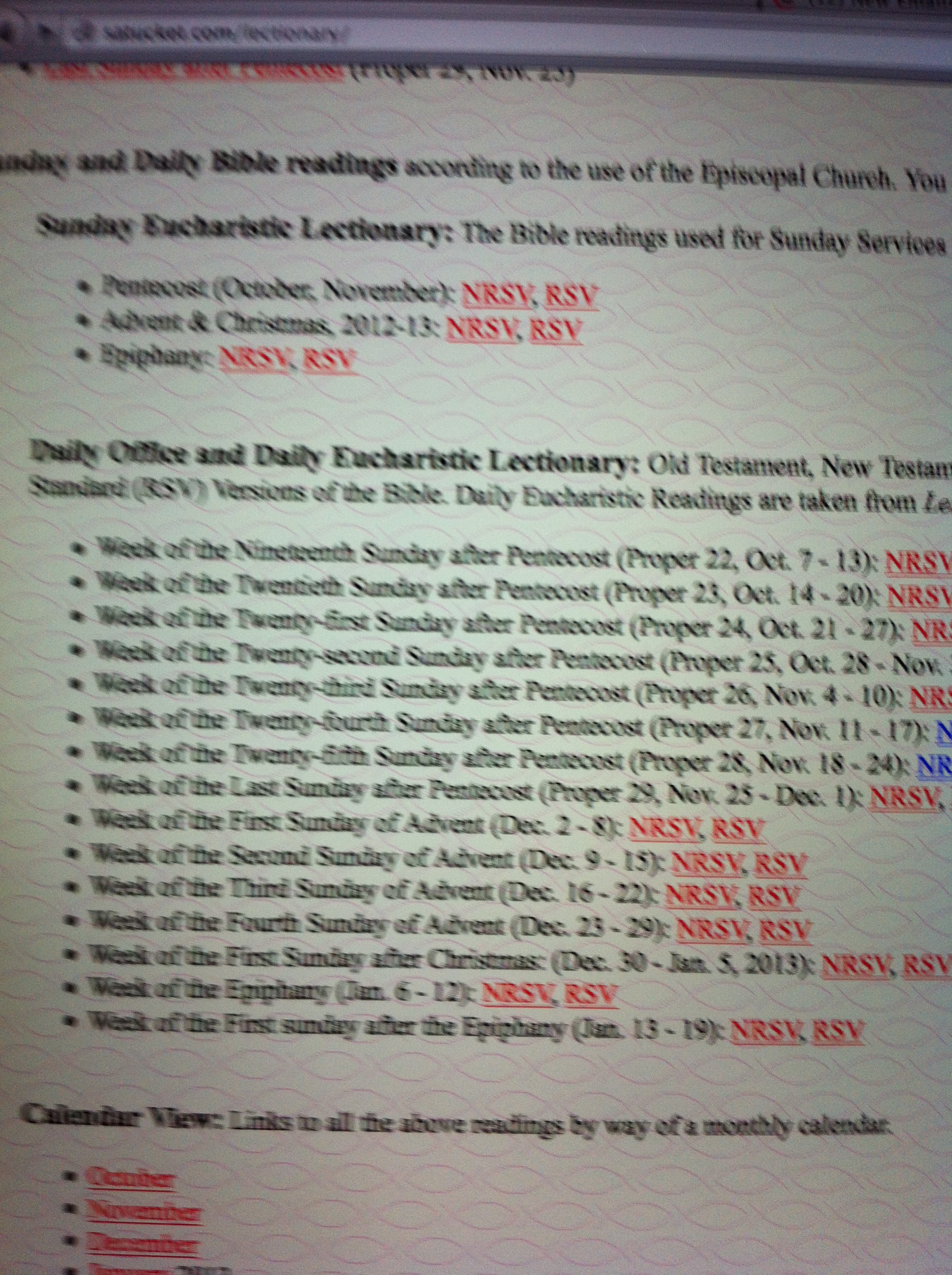 Note that two more weeks of the season of Pentecost until the church liturgical calendar moves to Advent. Depending on what version of the Bible you read, simply click on NSRV (New Revised Standard Version) or RSV (Revised Standard Version) and you will be lead to a page with the readings day by day,
